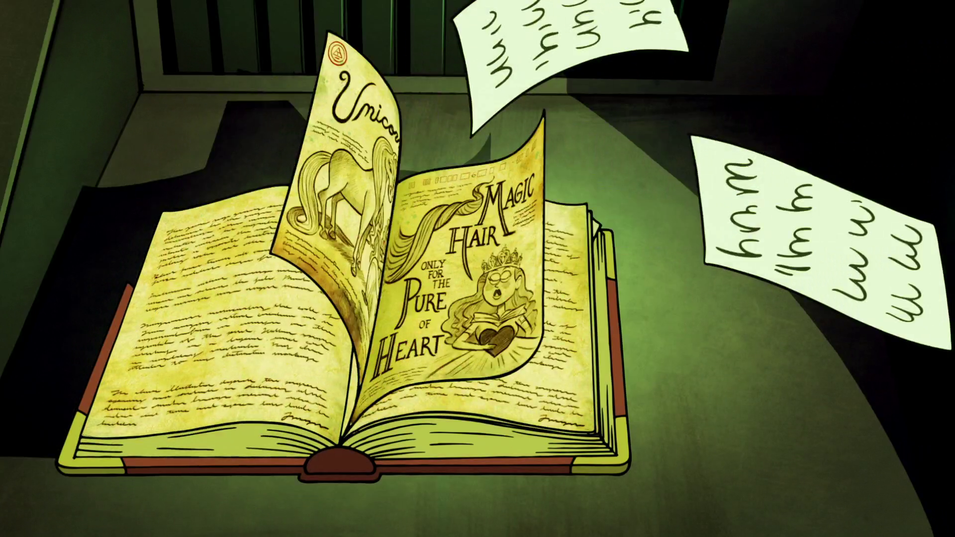 La página está mayormente ocupado por un esbozo de un unicornio, con su melena se trenzó en una mujer hermosa.
