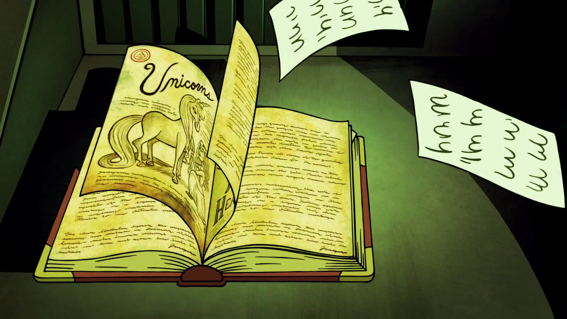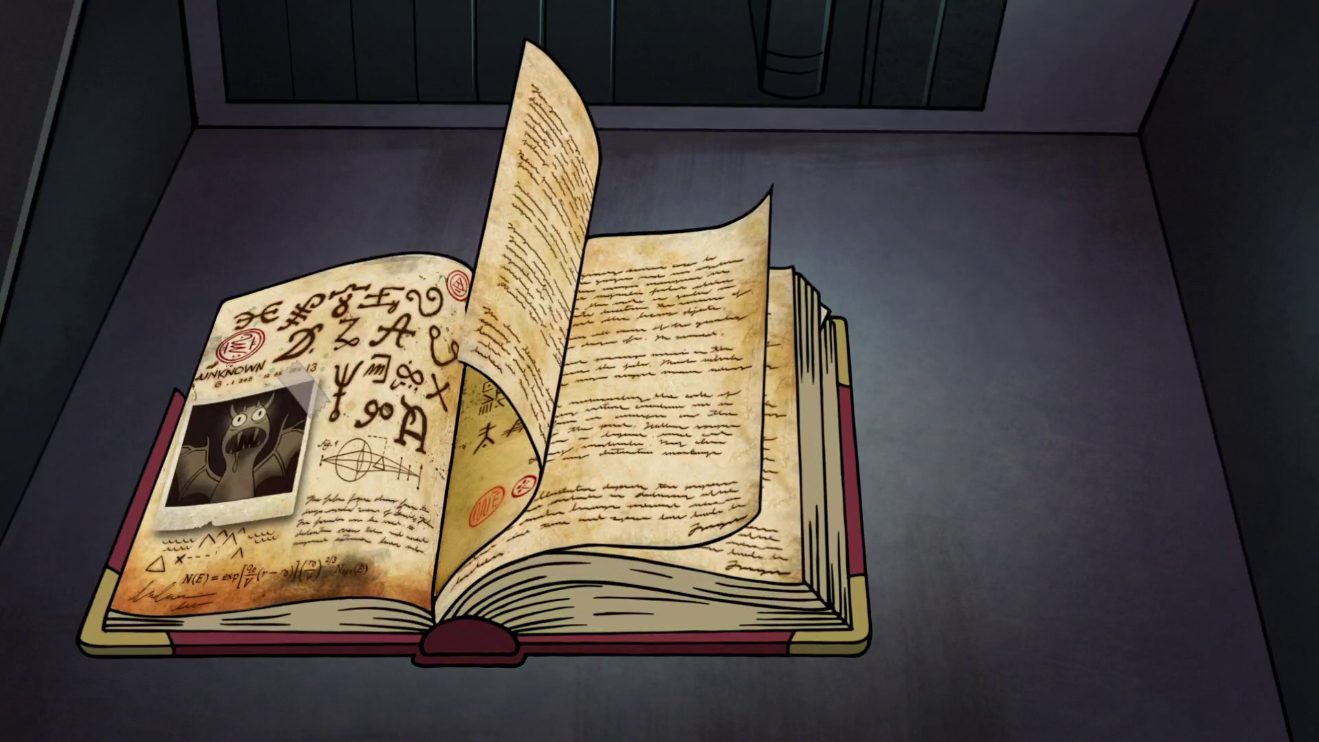 En la página de la derecha, hay un dibujo de Bill Cipher. También hay "Código Decoder # 8". La página es muy similar a la que se ve en el tema (excepto con los símbolos de la alquimia en la página de la izquierda que aparece al lado de la página de la derecha de la canción del tema). Hay un símbolo desconocido, junto a un símbolo alquímico conocido.